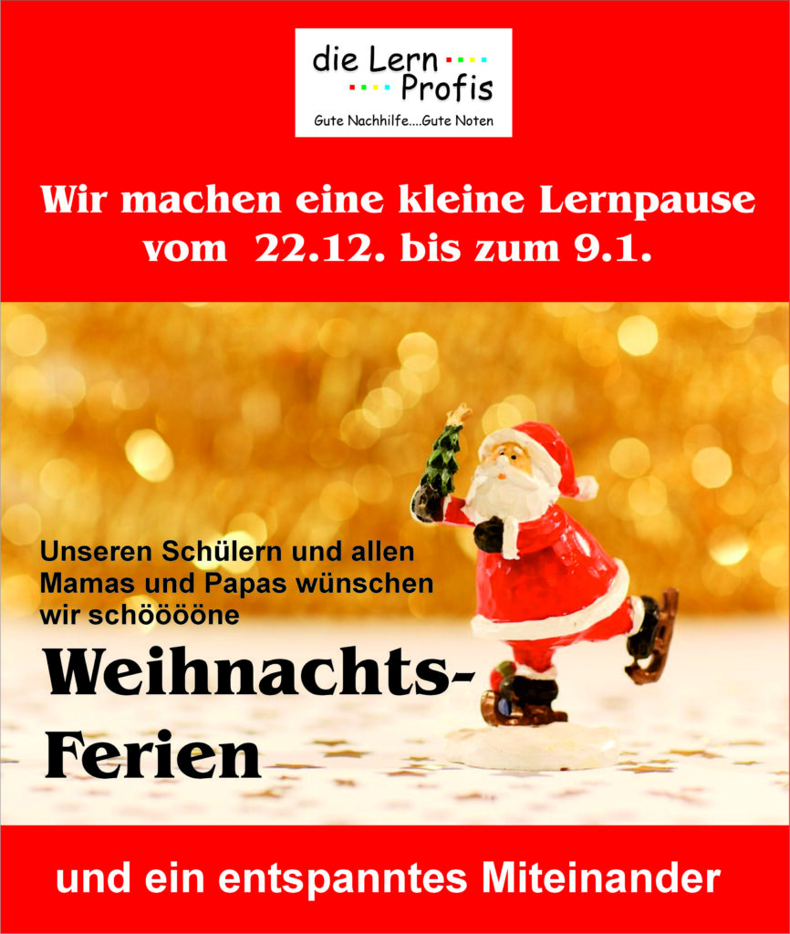 Hallo Frau Winter, auch ich wollte mich bei Ihnen noch bedanken. Ich will mir nicht vorstellen, wie es mit Marc ohne die Lernprofis gelaufen wäre. Insbesondere, dass sie immer versucht haben, auf alle erdenklichen Anfragen und Bitten eine Lösung anzubieten, hat mich sehr beeindruckt. Ihnen und ihrem Team ebenfalls Frohe Weihnachten und ein gesundes und erfolgreiches 2016. Ihr Jan R.