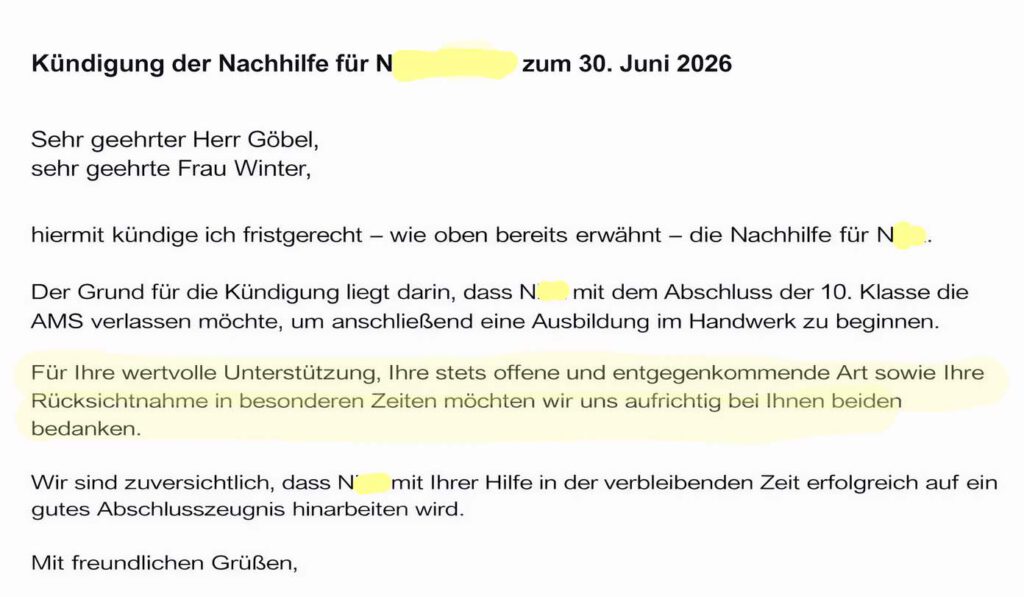 | Sehr geehrte Damen und Herren, da sich die schulische Laufbahn unseres Sohnes ….. nun wohl ihrem Ende nähert, kündigen wir hiermit seine Nachhilfe bei den Lernprofis zum 30.4.20xx. Wir danken Ihnen allen sehr für Ihre Unterstützung und Ihren freundlichen und unkomplizierten Kontakt, mit dem Sie uns Eltern immer mit ins Boot geholt haben, wenn es notwendig war. Mit einem lachenden und einem weinenden Auge wünschen wir Ihnen und Ihren Schülern weiterhin viel Erfolg und alles Gute! Mit freundlichen Grüssen, Alexandra ….. mit A… und S… |