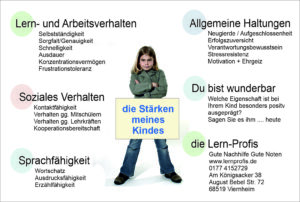 Erfolg in der Schule ist einer der Schlüssel für ein gesundes Selbstvertrauen, lebenslangen Spaß am Lernen und nicht zuletzt für eine chancenreiche berufliche Zukunft und ein erfülltes Leben. Neben der rein fachlichen Unterstützung sind uns die Motivation, das Selbstvertrauen und die Fähigkeit des eigenständigen Lernens unserer Schüler sehr wichtig.